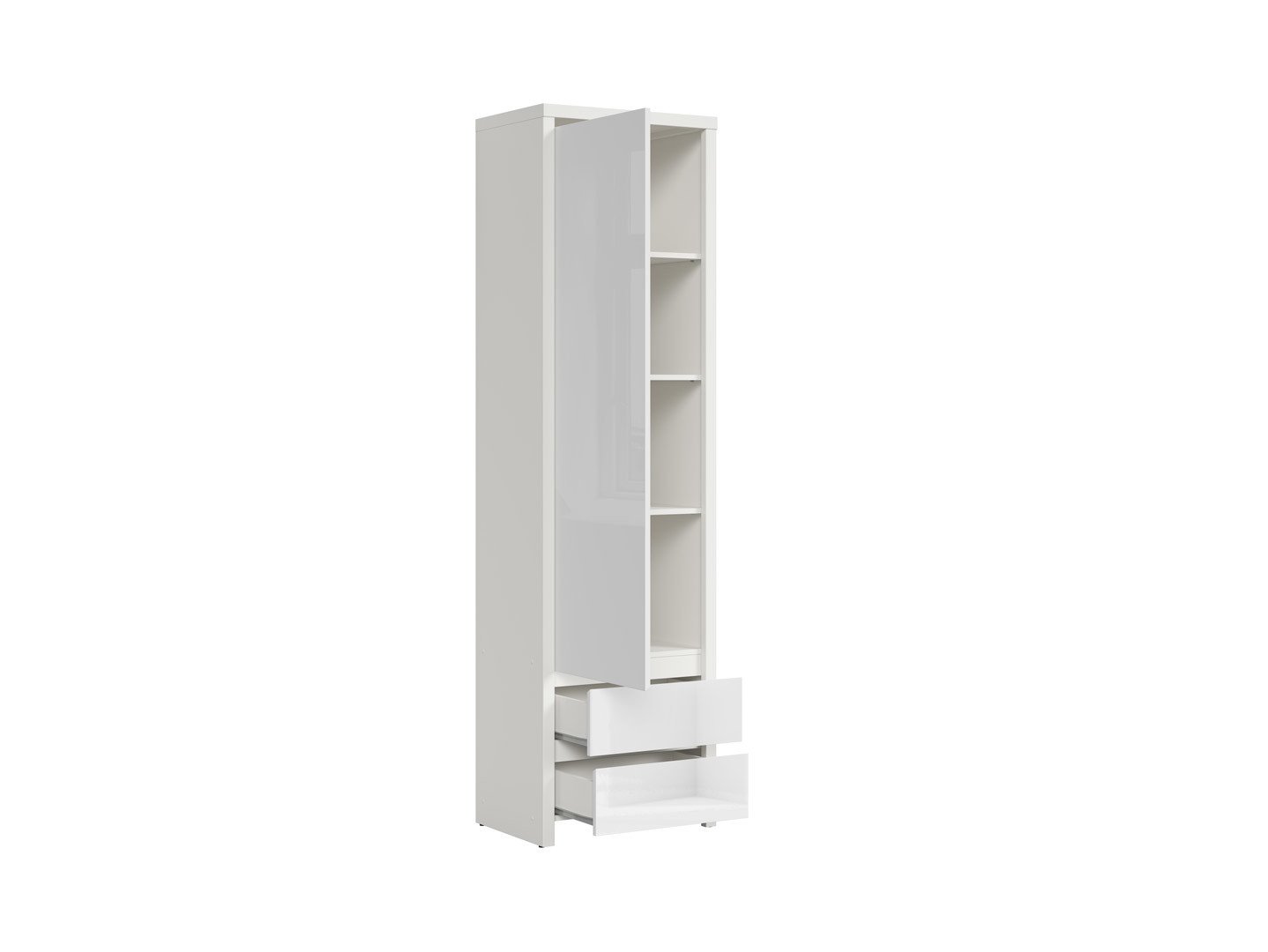 Висок бял шкаф с вратичка и две чекмеджета от ПДЧ, част от модулната система Каспиан Бял, предлагащ се в два варианта – с матирана или гланцирана повърхност.