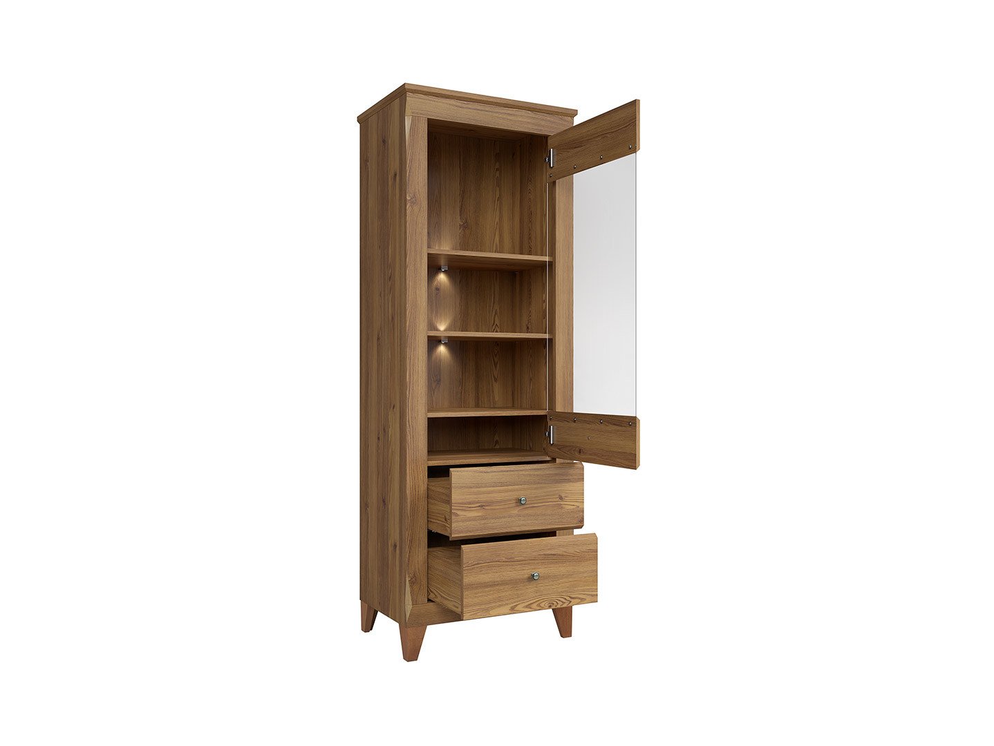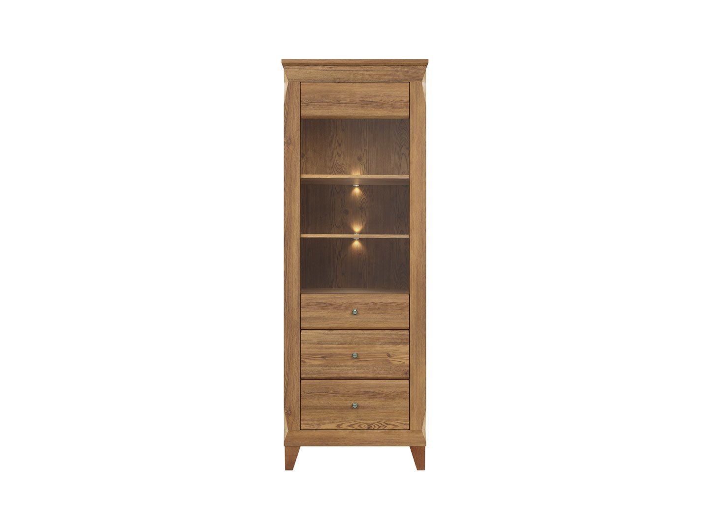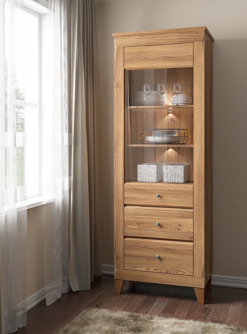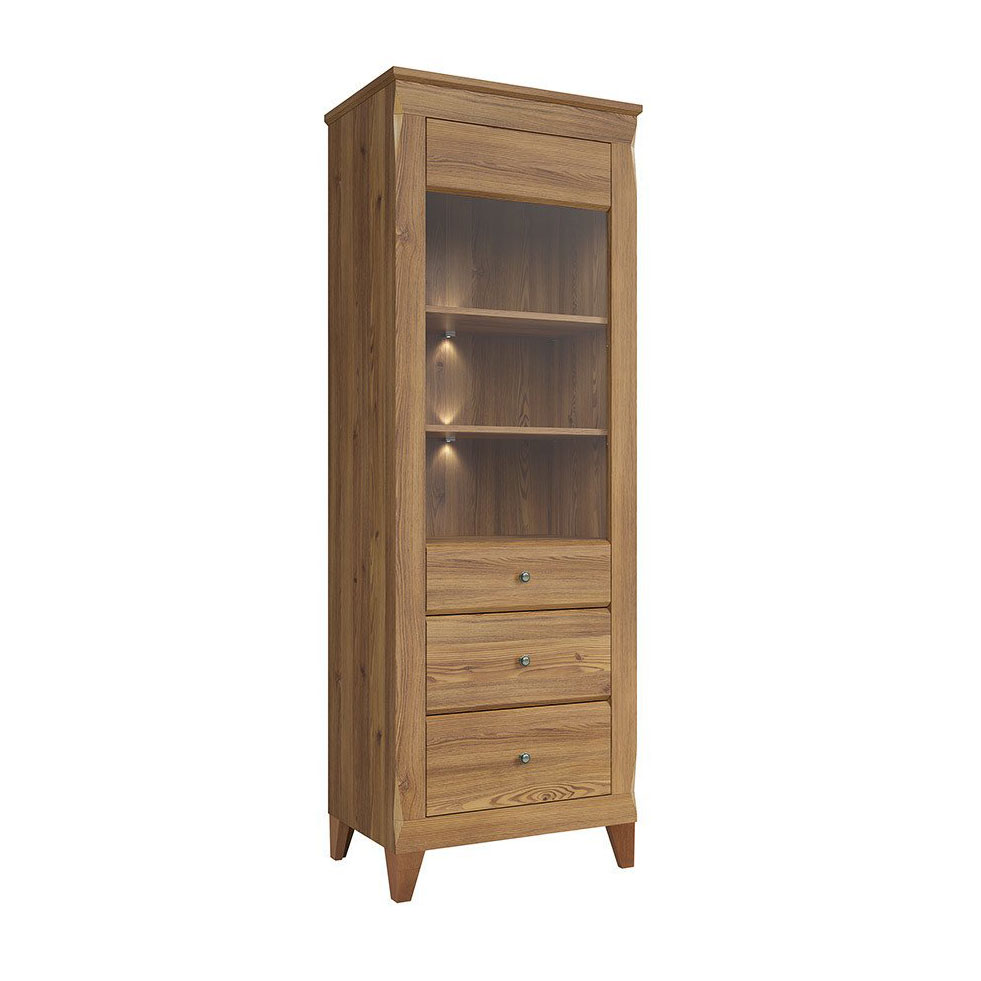 Висок шкаф, изработен от ПДЧ и МДФ със стъклена витрина и вградено LED осветление, както и две чекмеджета в цвят златна лиственица, модулна система Берген.