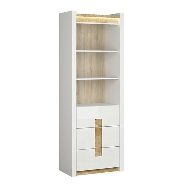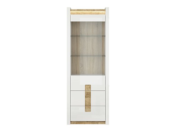 Висок шкаф с корпус в бял гланц, детайли в цвят уестминстърски дъб, два стъклени рафта с витрина, две чекмеджета и вградено LED осветление в горната част, модулна система Аламеда.