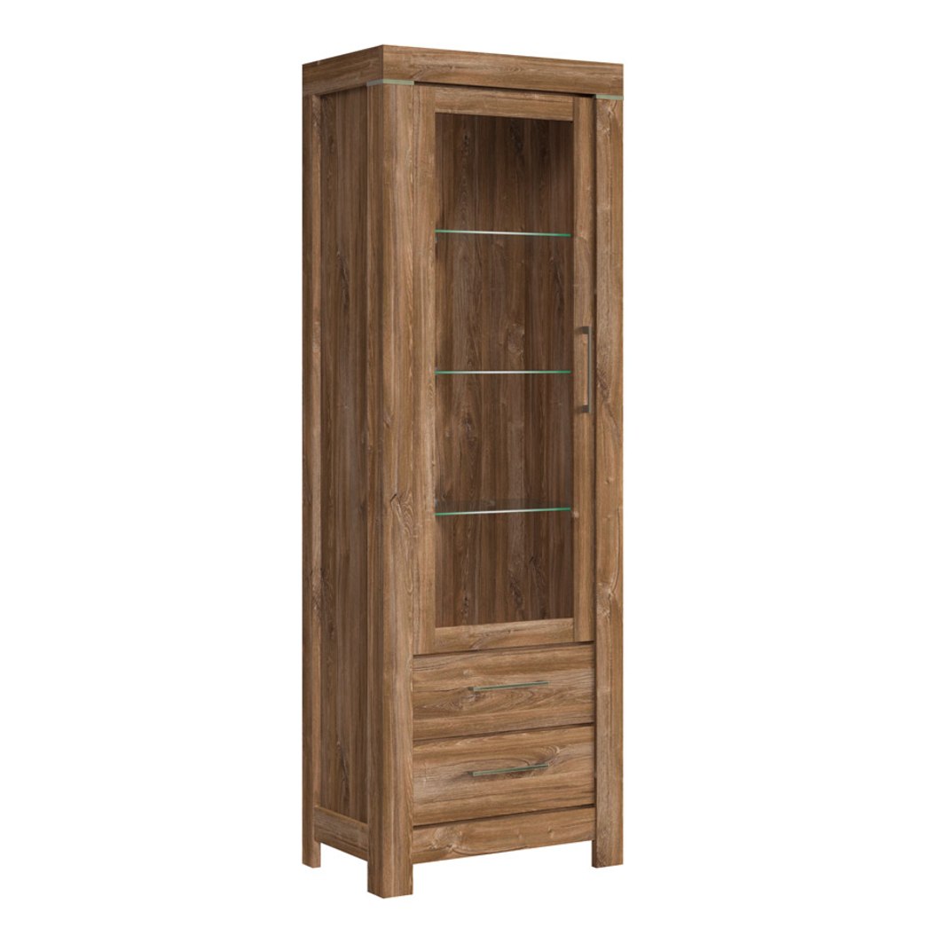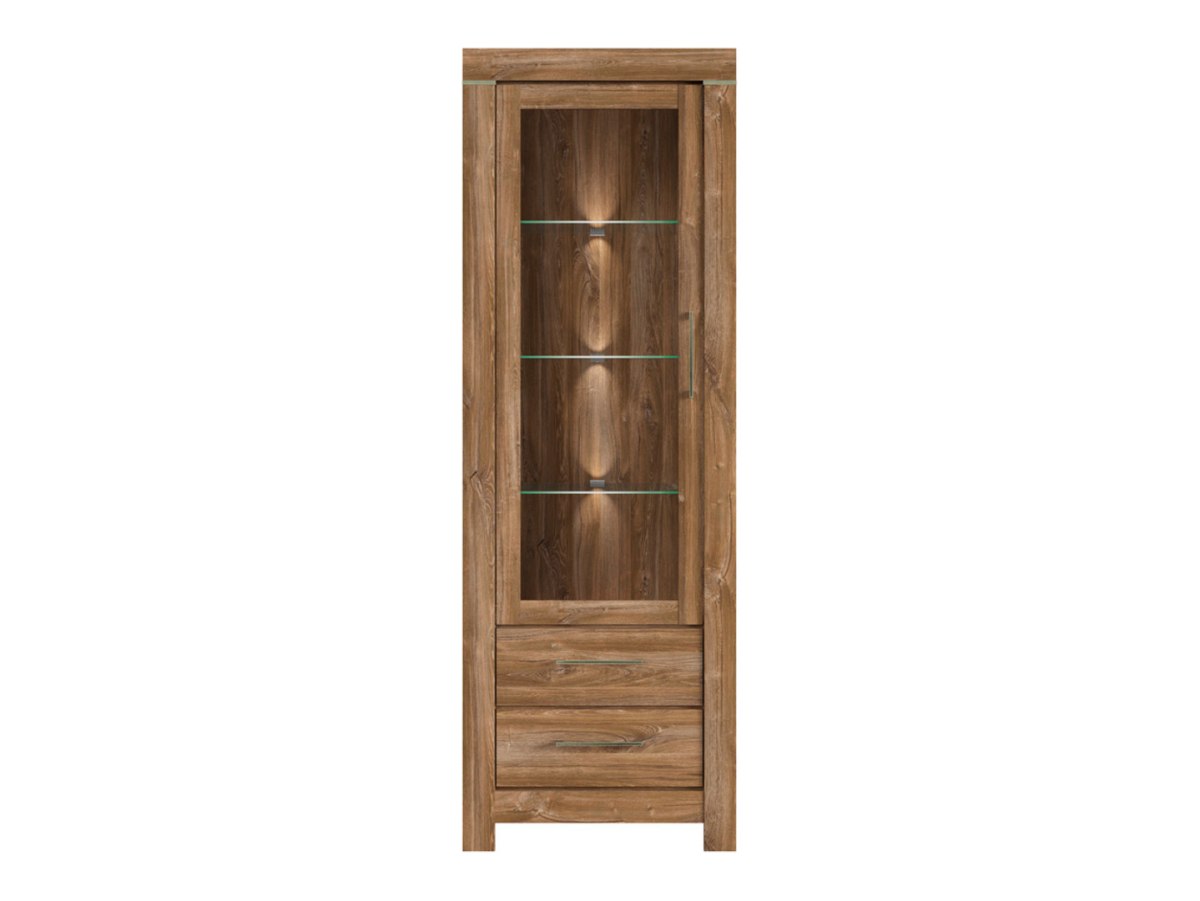 Висок шкаф витрина с LED осветление и корпус в дървесен цвят дъб стърлинг, модулна система Гент.