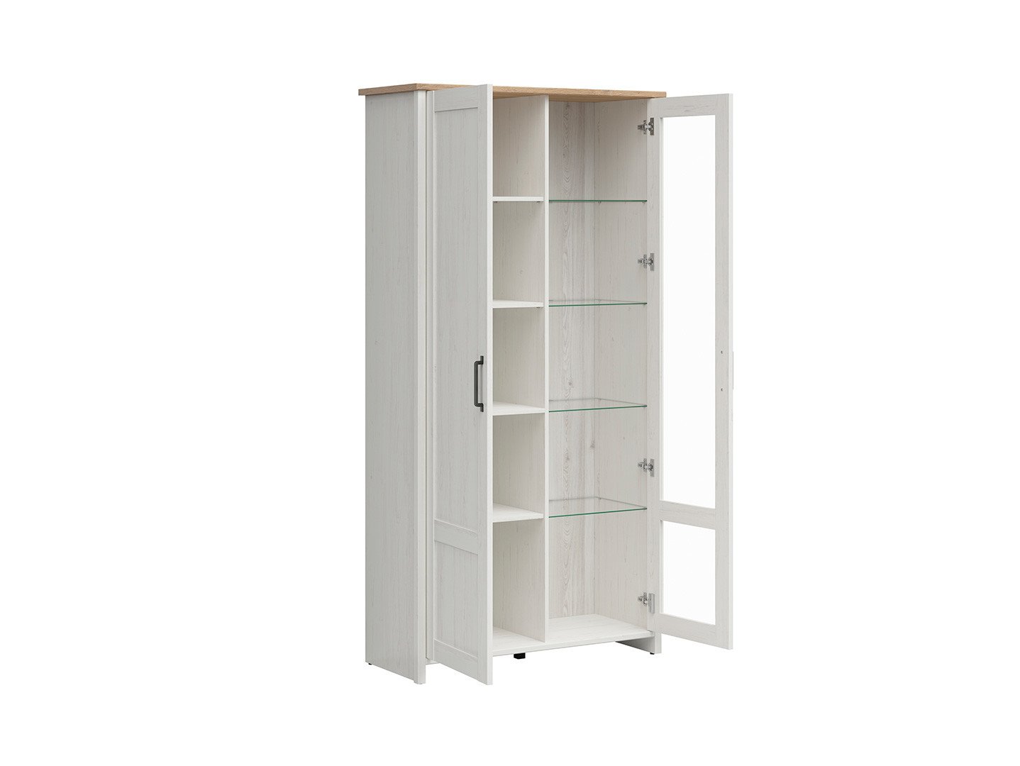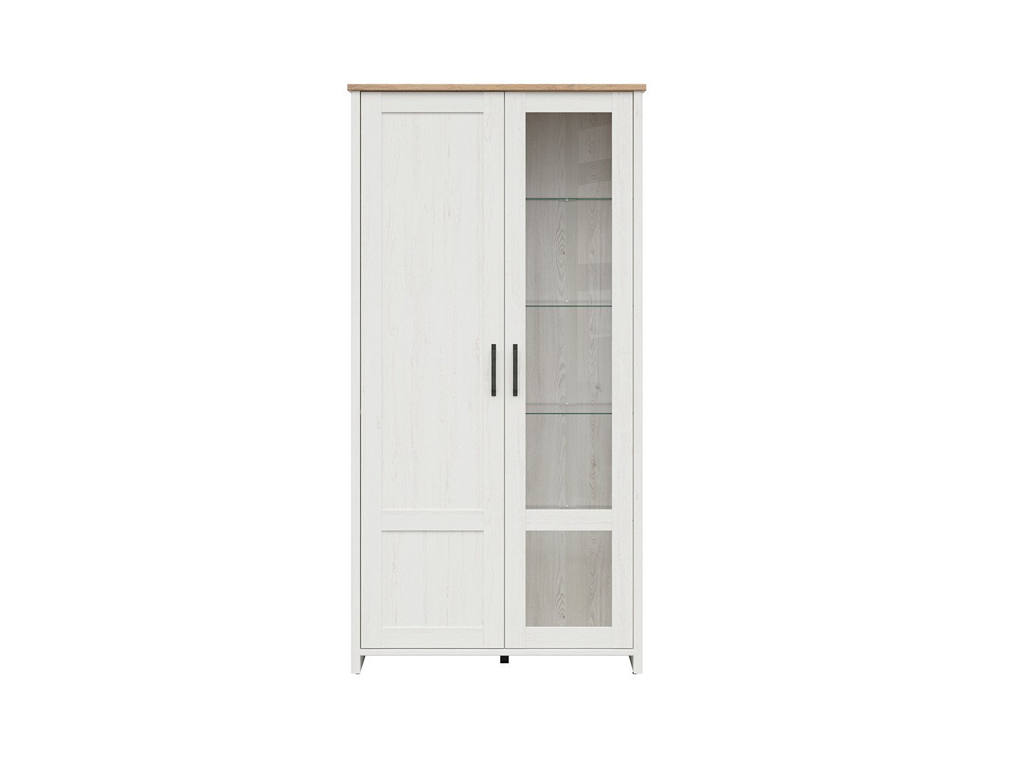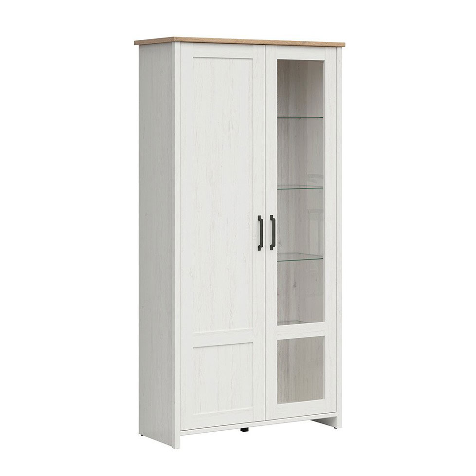 Висок шкаф, изработен от ПДЧ с корпус в цвят бял бор андерсън и горна част в цвят дъб грандсон, рамкирана и стъклена врата, черни метални дръжки и вградено осветление, модулна система Локса.