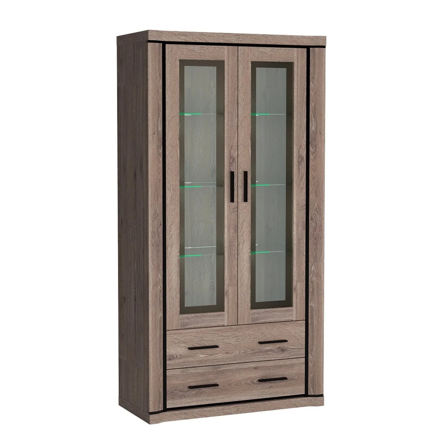 Шкафът разполага с три стъклени рафта за красиво изложение на декорации и сувенири, както и две функционални чекмеджета с допълнително пространство за съхранение. Черните лайсни и дръжки придават елегантен завършек и стилен акцент на визията.