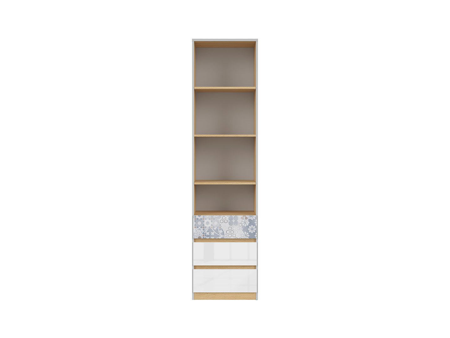 Висока етажерка с корпус в цвят полски дъб и светлосиво, четири открити рафта и три чекмеджета в бял гланц, модулна система Нанду.