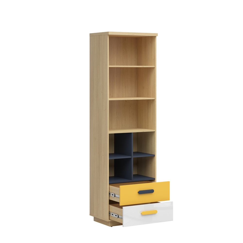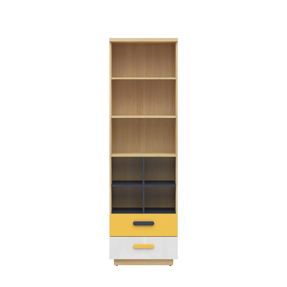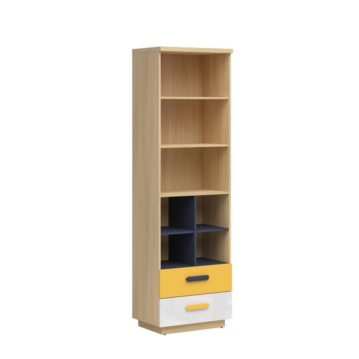 Висока свободностоща етажерка с две чекмеджета, изработена от ПДЧ в дървесен цвят полски дъб, бял гланц, жълто и тъмносиньо, модулна система Вескер.