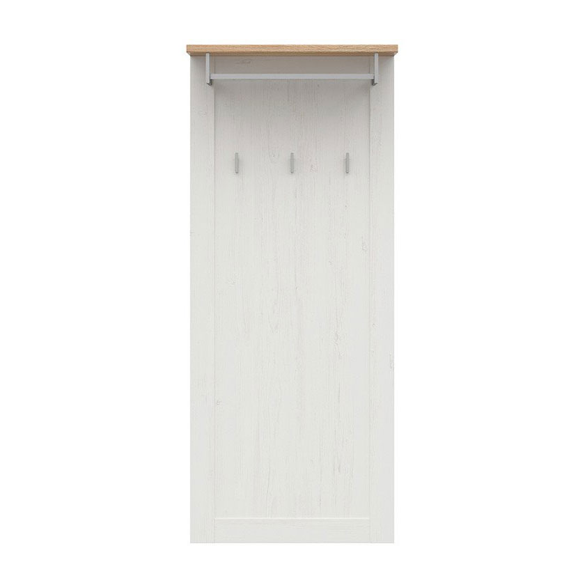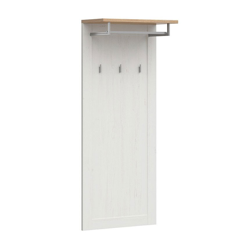 Закачалка за антре в скандинавски стил, изработена от ПДЧ с рамкиран заден панел в цвят бял бор андерсън, три практични куки, лост и горен рафт в цвят дъб грандсон, модулна система Локса.