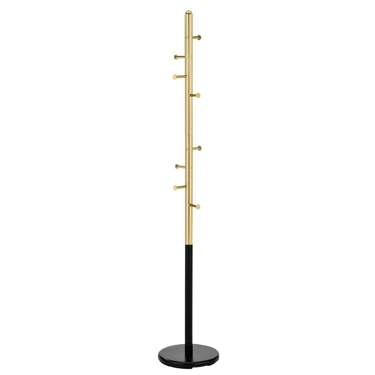 Свободностояща закачалка за коридор в златисто и черно с кръгла основа.