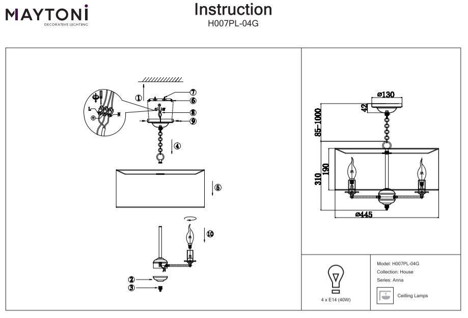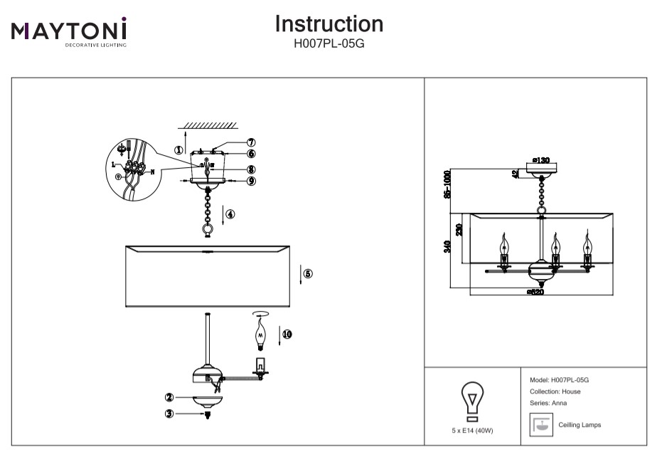 Вариант с 5 тела: шапка – ∅ 62 см, височина – 42,5-134 см, основа – ∅ 13 х 4,2 см, дължина верига – 95 см - Мощност: 4 или 5 х 40W