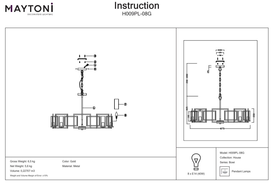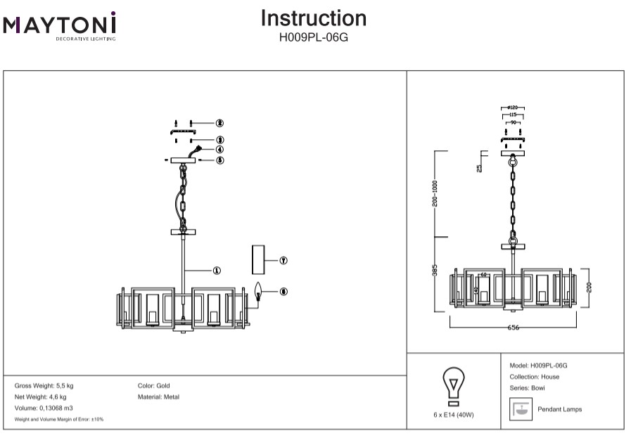 Вариант 2: диаметър – 87,5 см, височина – 60,5 – 143,5 см, основа – ∅ 12 х 2,5 см, дължина верига – 97 см - Мощност: 6 или 8 х 40W