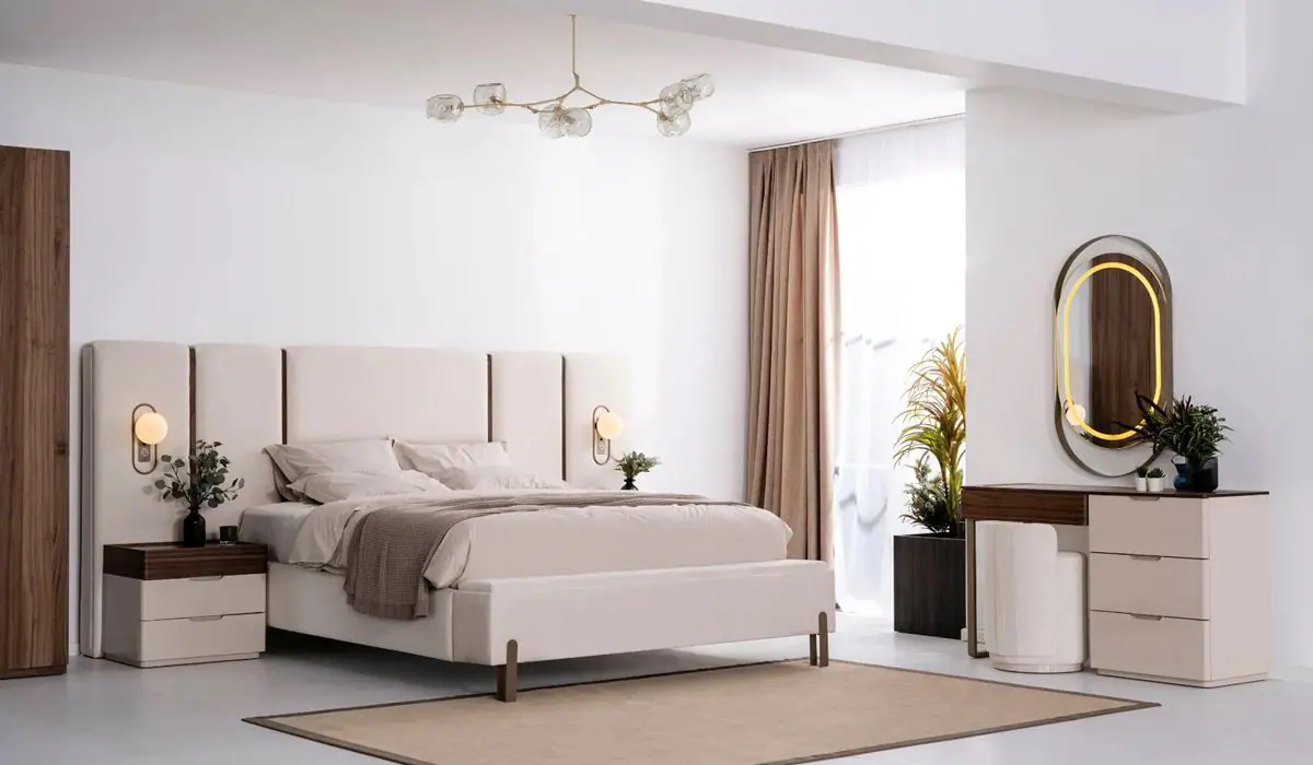 Спален комплект Бриел е перфектия избор за всеки, който търси модерна визия и изключителен комфорт. Обзавеждането за спалня е решено в светъл пясъчен цвят с контраст от дървесен цвят орех.